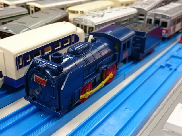 2022-07-27 青D51 プラレールオリジナル青デゴイチ 知ってる人は知っている。昔なぜか製品い存在した青いD51。遊び半分で新動力の旧製品を塗り替えて再現してみました。 改造要素は一切なし!塗装にはタミヤカラーのブルーを使用しました。 オリジナル版には存在しなかった炭水車も一緒に用意しました。石炭部分はマスキングして成型色のままです。ナンバープレートは新動力版に合わせて明朝体フォントながら、試作品などで見かける赤地のナンバープレートに仕立てました。 府中にてオリジナル版と対面。全然色が違いましたね(爆)